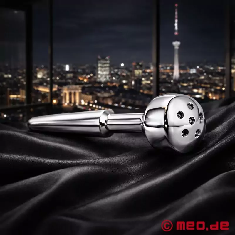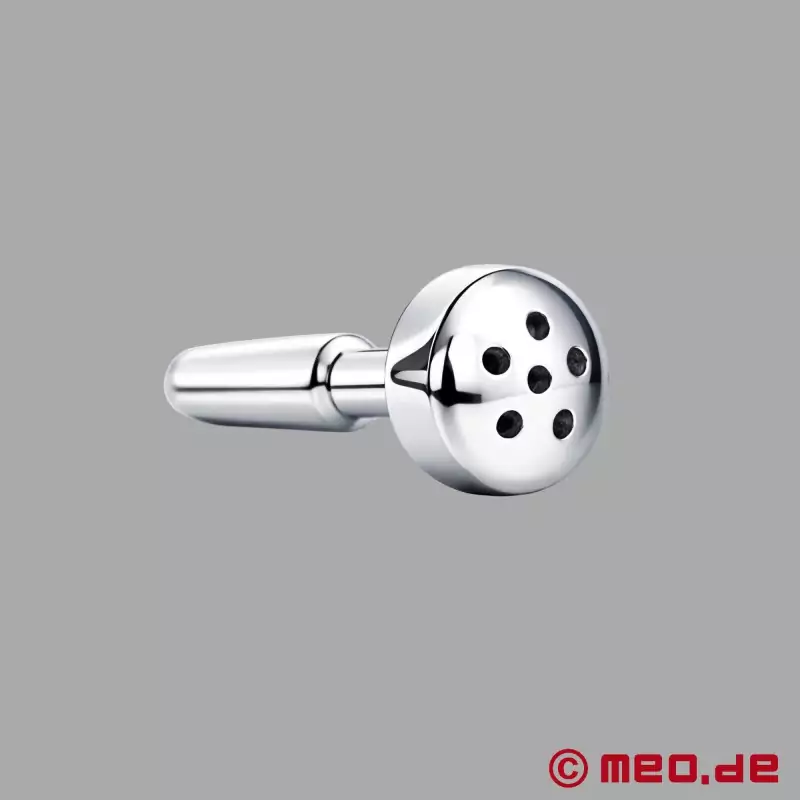 Este plug uretral con orificio pasante y accesorio aspersor, fabricado en un proceso CNC a partir de una aleación aeroespacial noble, permite una inserción muy gradual y también es adecuado para el usuario aún no tan experimentado. Su forma muy probada (cónica ascendente y descendente) garantiza que el Plug para el Pene con Aspersor permanezca firmemente en su sitio incluso en las circunstancias más duras.