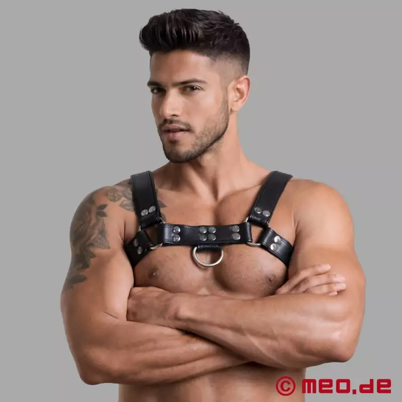 Nuestro arnés de cuero garantiza un aspecto masculino. Está sólidamente fabricado, disponible en diferentes tamaños y equipado con anillas para fijar accesorios bondage adicionales.