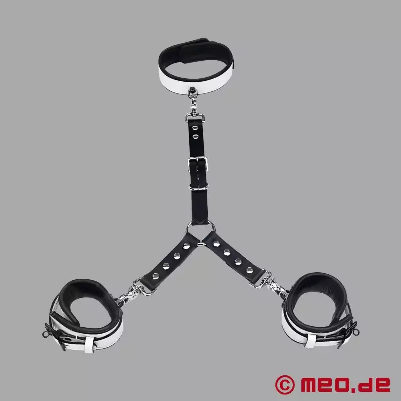Con nuestro conector de 3 puntos, ajustable en longitud y con forma de Y, también conocido como conector BDSM, las esposas, las grilletes o las correas de los muslos se pueden conectar de forma eficaz y cómoda a la anilla en D de un collar. Esto abre un amplio abanico de posibilidades en bondage, por ejemplo, para fijar una posición corporal inclinada hacia delante o para conectar las manos o los pies por detrás de la espalda al collar. Este maravilloso accesorio puede utilizarse incluso como conector de Hogtie. Simplemente deja volar tu imaginación.