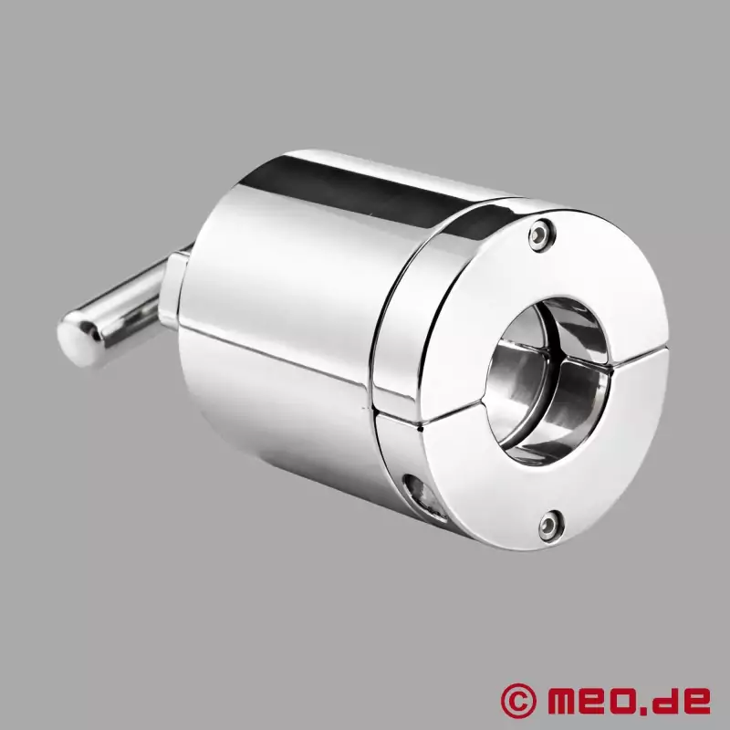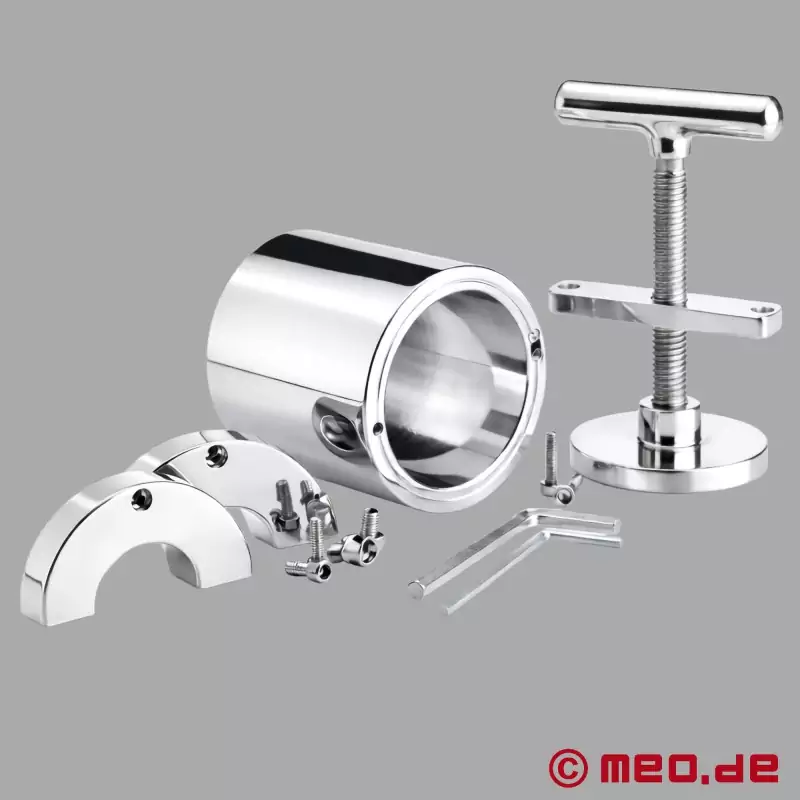 Su atractivo especial reside en su diseño claro y funcional. En cuanto se coloca el estirador de testículos y se fija el cilindro de acero, se crea un sistema cerrado que permite un uso muy específico y controlado. La presión puede regularse gradualmente mediante el mango en T y el husillo integrado, desde muy controlada hasta bastante más intensa, según la experiencia, las preferencias y el escenario.