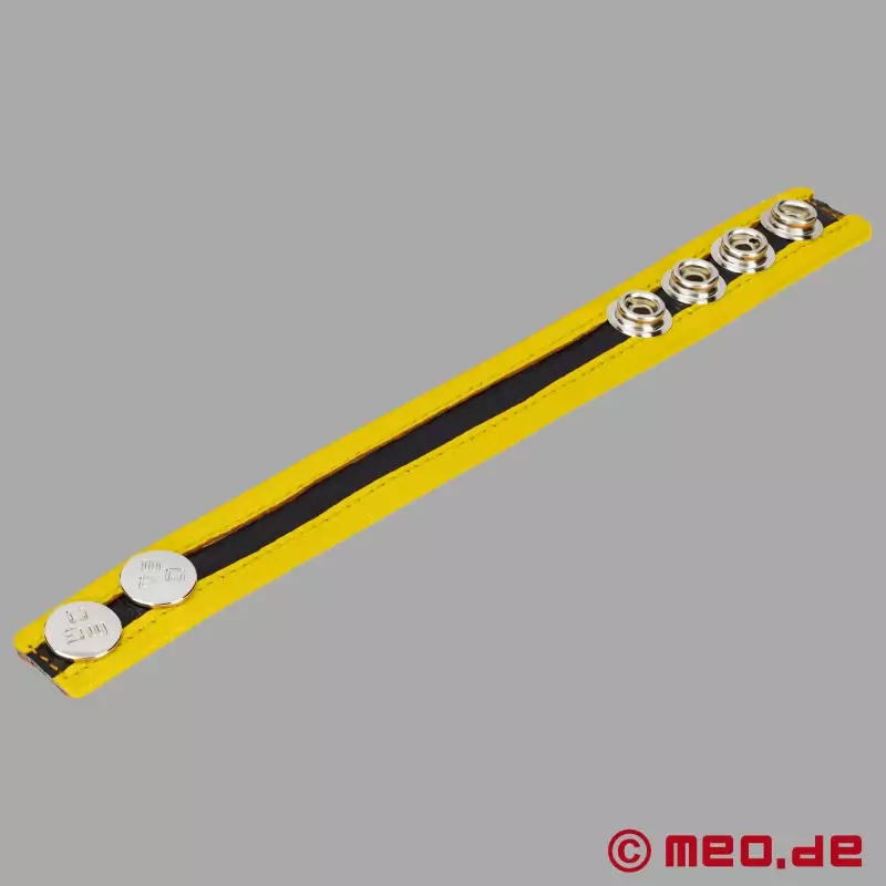 Ajuste cómodo, diseño clásico y manejo sencillo. Gracias a su cierre de botones a presión, este cockring de cuero negro y amarillo se ajusta con precisión al tamaño deseado y queda perfectamente colocado. El color amarillo se asocia tradicionalmente con la preferencia por el «watersports kink».