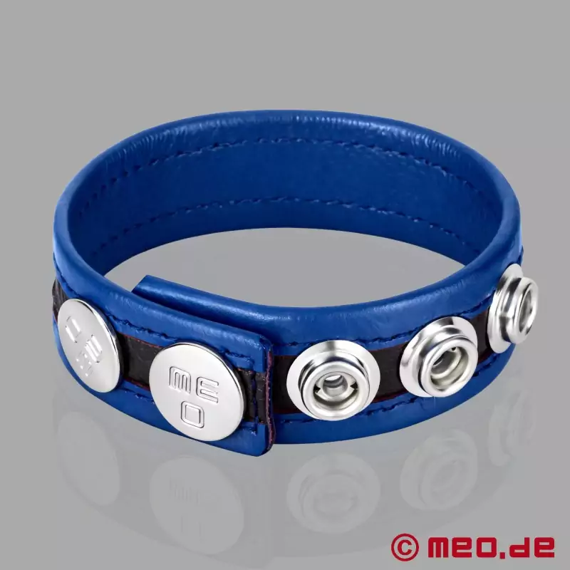 Ajuste cómodo, diseño clásico y manejo sencillo. Gracias a su cierre de botones a presión, este cockring de cuero negro y azul se ajusta con precisión al tamaño deseado y queda perfectamente colocado. El color azul se asocia tradicionalmente con una actividad sexual dominante.