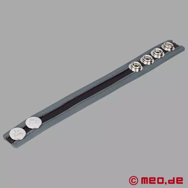 Ajuste cómodo, diseño clásico y manejo sencillo. Gracias a su cierre de botones a presión, este cockring de cuero negro y gris se ajusta con precisión al tamaño deseado y queda perfectamente colocado. El color gris se asocia tradicionalmente con la preferencia por el «bondage».