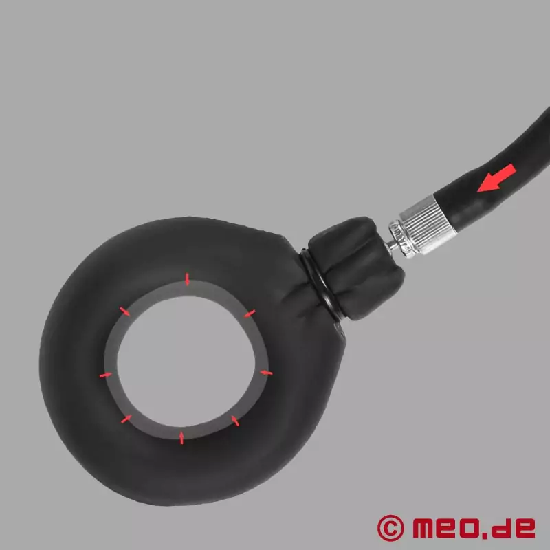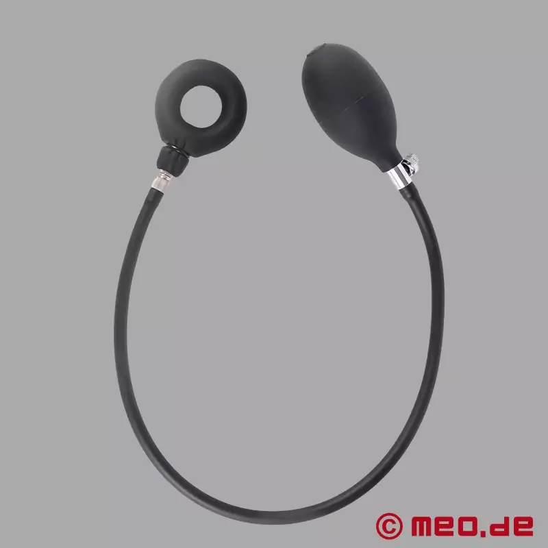 Lo utilizas exactamente donde más te guste. Deslízalo sobre el glande y colócalo debajo del glande o llévalo más abajo, hasta la base del pene, para que quede alrededor del tronco. Por supuesto, también puedes utilizarlo como estirador de testículos por encima de los testículos. También puedes colocarlo alrededor de un solo testículo, porque no hay límites para tu imaginación. Ahora utiliza la bola de bombeo y bombea hasta que el anillo esté bien apretado, encaje perfectamente y ejerza la presión que desees (de suave a extrema). Ahora puedes retirar el tubo y la bola de bombeo del anillo y.... (dejaremos el resto a tus fantasías eróticas).