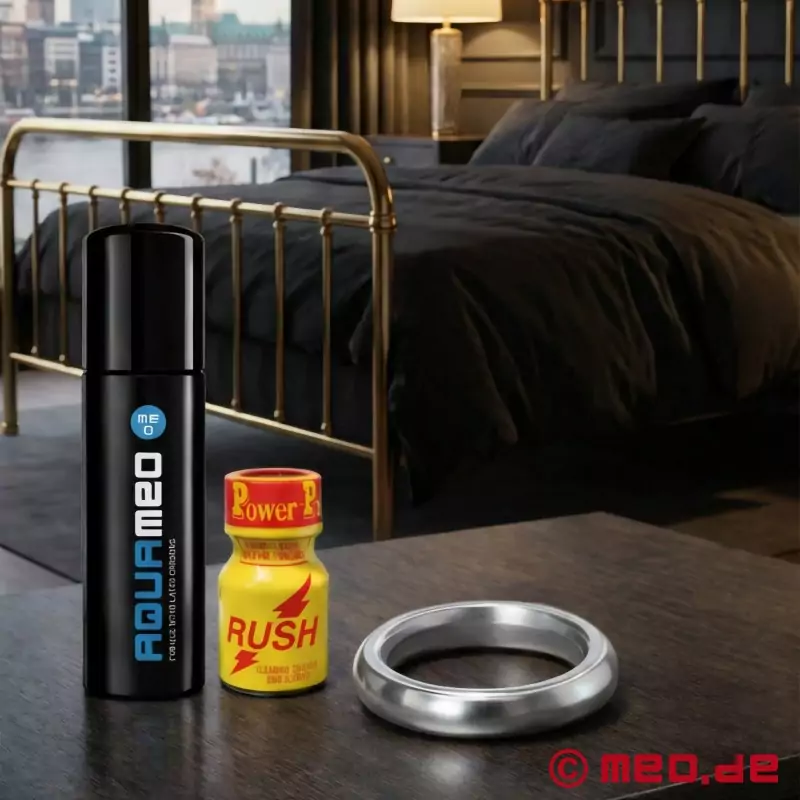 Para colocar el anillo sobre el pene y los testículos, recomendamos nuestro lubricante de base acuosa Aquameo. Las instrucciones de uso se incluyen con cada anillo para el pene. Después de usarlo, debes limpiar el anillo para el pene con nuestro spray InstaClean.
