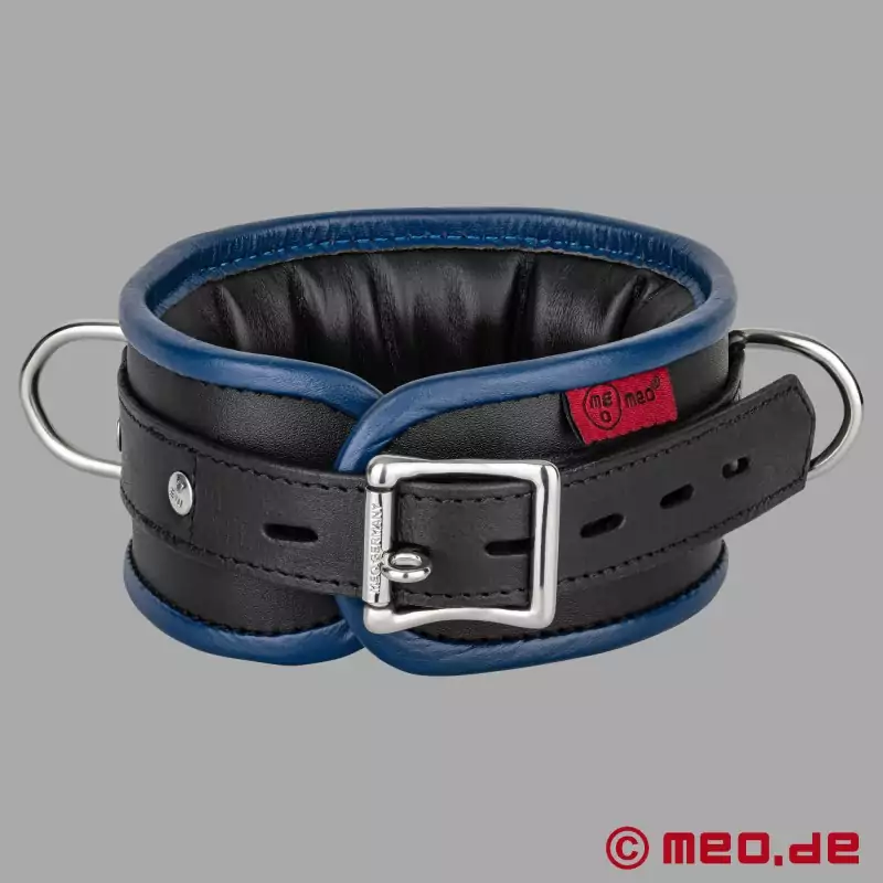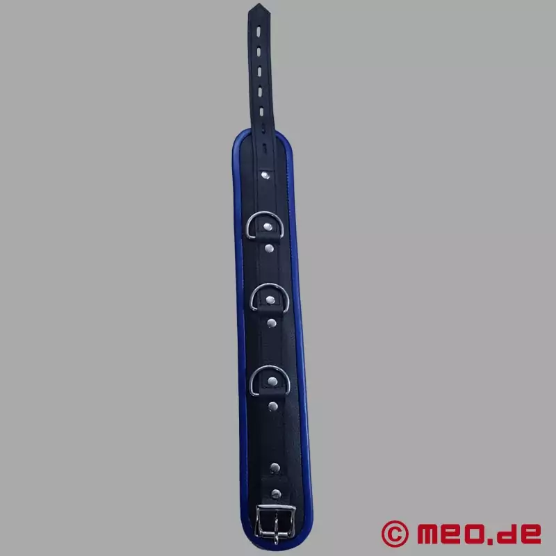 Gracias al cuero especial y a la elaborada confección, el collar BDSM ofrece una comodidad de uso óptima, de modo que el collar negro/azul puede utilizarse para algo más que una sesión de bondage. Puedes enganchar una correa de esclavo o cadenas con mosquetones a 3 anillas de acero inoxidable para tener siempre a tu Sub bajo control.