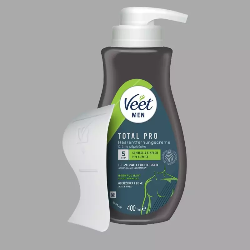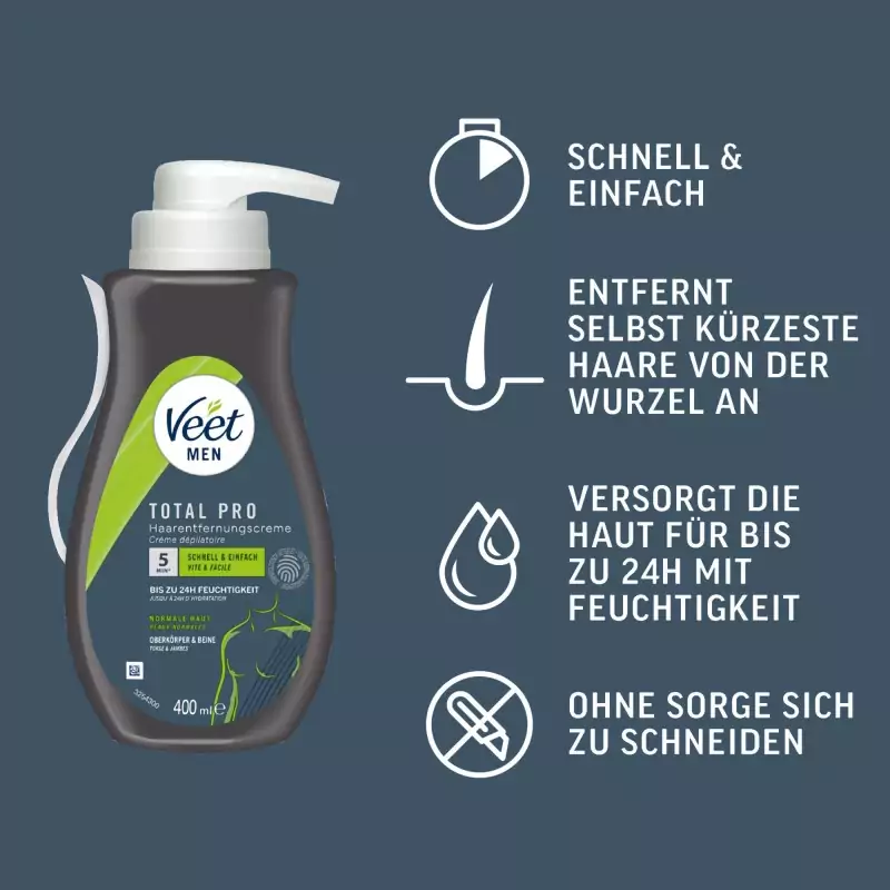 Veet Men Total Pro™ Crema Depilatoria ha sido desarrollada especialmente para satisfacer las necesidades de la piel masculina. Está disponible en un práctico envase de 400 ml con dispensador. Elimina el vello corporal no deseado de forma rápida y eficaz. La crema deja la piel visiblemente suave, la hidrata durante 24 horas y permite la depilación del torso y las piernas sin el riesgo de cortes característico del afeitado.