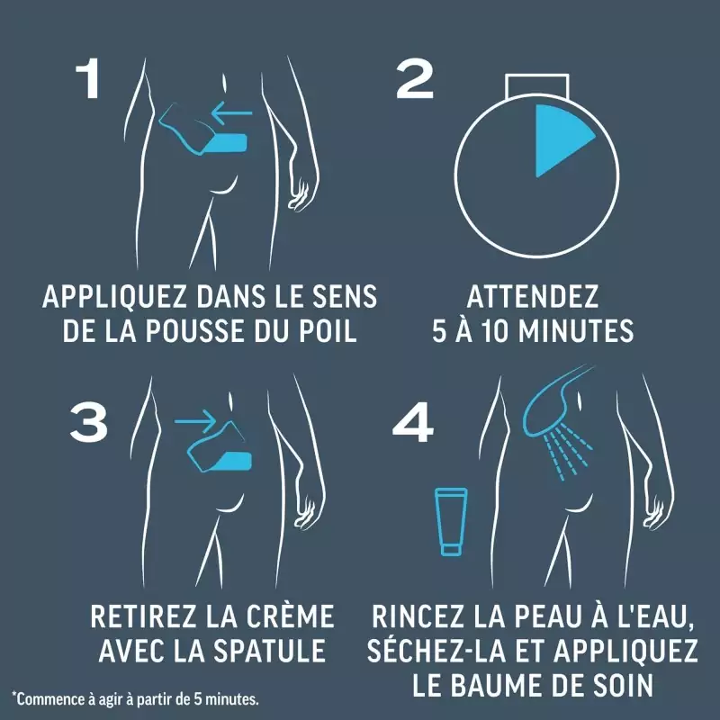 Antes de utilizarlo, leer y seguir todas las advertencias importantes. Aplicar la crema de manera uniforme, cubriendo completamente el vello. La acción comienza a partir de los 5 minutos. Tras 5 minutos, comprobar en una pequeña zona si el vello ya se retira. Si es necesario, dejar actuar unos minutos más, pero sin superar los 10 minutos en total. A continuación, retirar la crema con la espátula y aclarar la piel cuidadosamente con agua. Por último, aplicar el bálsamo para hidratar y calmar la piel.