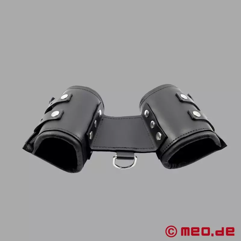 Las esposas de cuero están firmemente unidas entre sí mediante un inserto de cuero trapezoidal (monoesposas) y son muy cómodas de llevar. Las esposas, agradablemente acolchadas, están provistas de cierres de hebilla, por lo que pueden ajustarse con precisión alrededor de las muñecas. Puedes fijar los brazos por delante del cuerpo o por detrás. Se pueden fijar cuerdas, correas, cadenas, etc. a la resistente anilla en D.