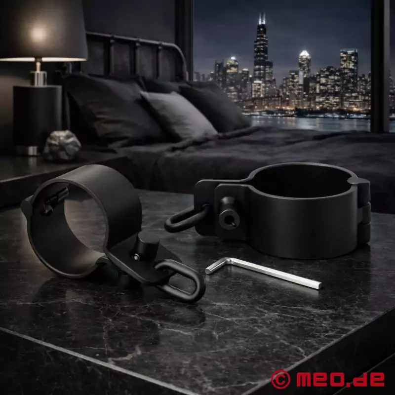 Las esposas, que tienen bisagras, se pueden cerrar con un tornillo Allen y están equipadas con ojales soldados resistentes. Esto permite combinarlas de forma flexible con cadenas, cinturones de bondage o fijaciones de pared. Sus superficies interiores están desbarbadas y pulidas, lo que garantiza un ajuste seguro y firme alrededor de muñecas de diferentes tamaños.