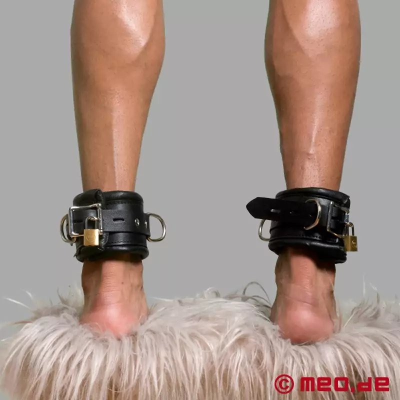 La serie Black Berlin™ de MEO® incluye, además de estas tobilleras de cuero, esposas a juego y un collar con cierre y candado. Los candados con llave igual permiten manejar de forma uniforme todas las sujeciones con cierre. El paquete de las tobilleras incluye dos candados con llave igual. Esto supone una ventaja, ya que las esposas, las tobilleras y el collar de la misma serie se pueden cerrar y abrir con la misma llave. Para configuraciones de bondage temporizadas, como en el caso del self-bondage, es posible utilizar como accesorio adicional un candado digital con temporizador, como el MEOBond®, según el escenario deseado y la experiencia individual.
