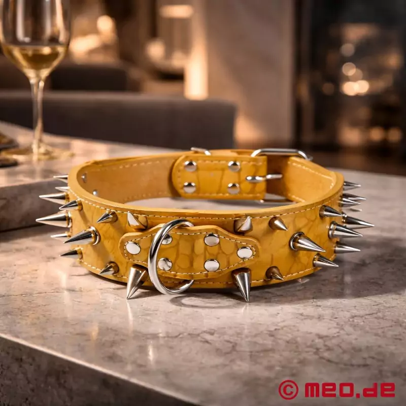 Gracias a su aspecto de piel de cocodrilo y sus puntiagudos pinchos, un collar de oro para perros es el accesorio más lujoso para el Human Puppy.