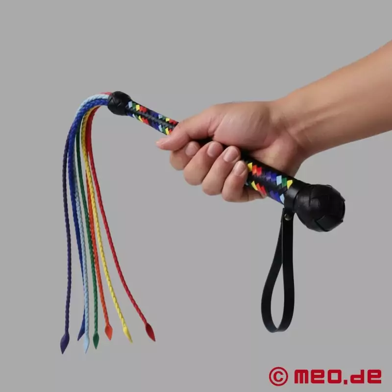 Experimenta la combinación perfecta de precisión e intensidad con el Cat-O-7-Colas trenzado. Este exquisito látigo BDSM no sólo es un colorido homenaje al orgullo gay, sino que también proporciona golpes potentes y precisos con sus siete hebras de látigo trenzadas de 6 mm de grosor. Cada golpe de este lujoso látigo termina en un punzante dolor de placer, que recuerda a los golpes con una fusta, dejando una intensa sensación de ardor en la piel de tu pareja.
