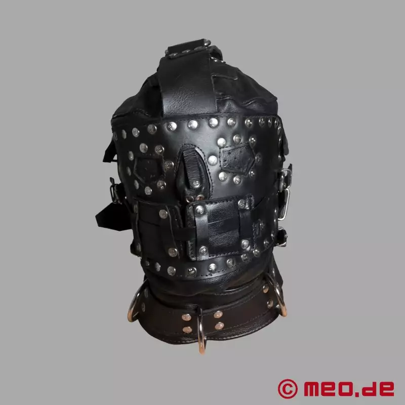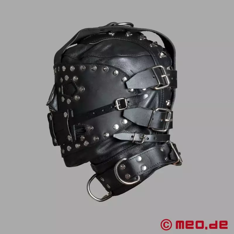La máscara está fabricada con casi un kilo de cuero y ofrece un grado de aislamiento y privación sensorial sin precedentes. Cada contacto e incluso la propia respiración se intensifican, de modo que todos los sentidos se experimentan de una forma nueva. Se puede cerrar una pesada cremallera metálica sobre la boca y se puede atar una máscara desmontable sobre los ojos, lo que aumenta aún más la privación sensorial.
