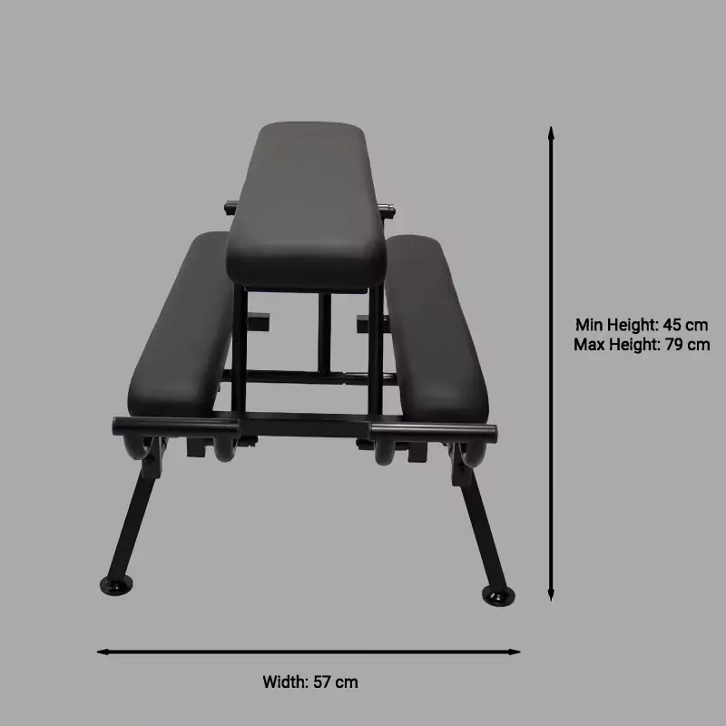Primero se eligen la altura y la inclinación deseadas mediante las dos barras de acero y, a continuación, se encajan las tuercas de mariposa en los puntos de bloqueo y se aprietan. Una vez alcanzada la posición deseada, las asas ofrecen una sujeción segura y mayor estabilidad. Las patas antideslizantes reducen el riesgo de deslizamiento o vuelco, incluso durante sesiones más dinámicas.