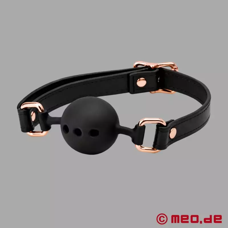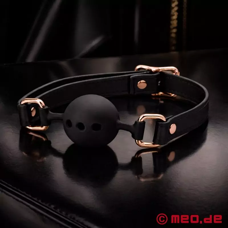 La combinación de negro intenso y oro rosa brillante confiere a la mordaza BDSM un aspecto irresistiblemente lujoso. Elegante y extremadamente eficaz, la mordaza de bola de MEO pone fin a las charlas superfluas en un abrir y cerrar de ojos. El cierre de hebilla del cinturón permite sujetar la mordaza con especial firmeza alrededor de la cabeza y garantiza el silencio del Sub. La bola de silicona de la mordaza tiene varias aberturas que facilitan la respiración mientras el Sub está amordazado y/o atado. El cuero vegano es cómodo de llevar y la conexión de silicona protege las comisuras de la boca. Como la bola amordazadora es de silicona, el Sub puede morderla sin dañar la bola ni los dientes. Todos los materiales utilizados son veganos y no contienen níquel.
