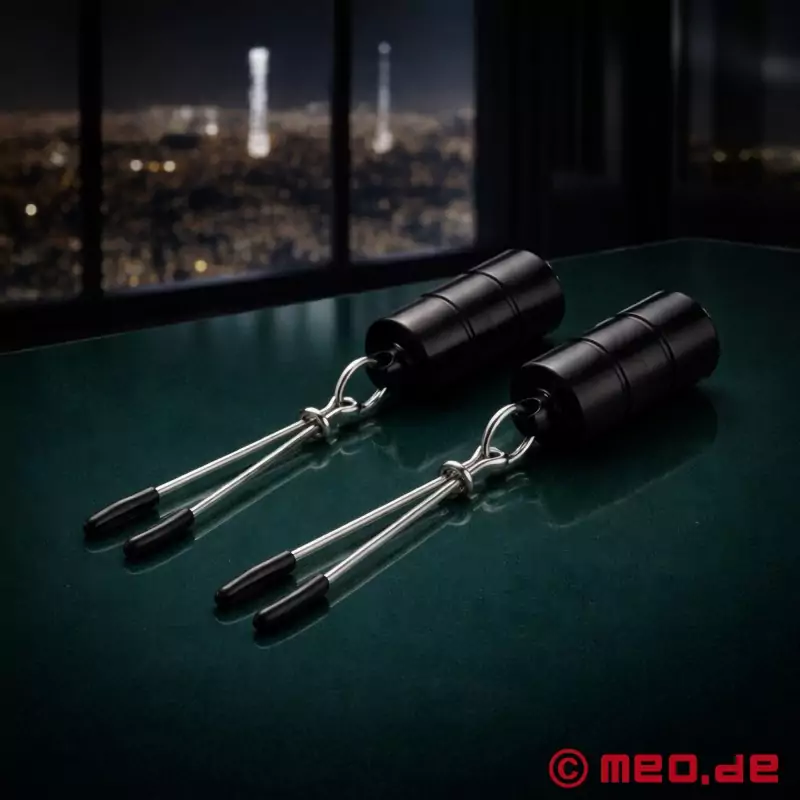 Las pesas firmemente sujetas de 100 gramos cada una añaden una dimensión extra al placer, ya que aumentan la presión y la gravedad, lo que resulta en una estimulación más fuerte y satisfactoria. El tirón constante sobre los pezones intensifica las sensaciones y las aumenta hasta el éxtasis. Las tapas protectoras de vinilo que encierran la superficie de sujeción de las pinzas para pezones garantizan la seguridad, la comodidad y un agarre óptimo de las pinzas en los pezones.