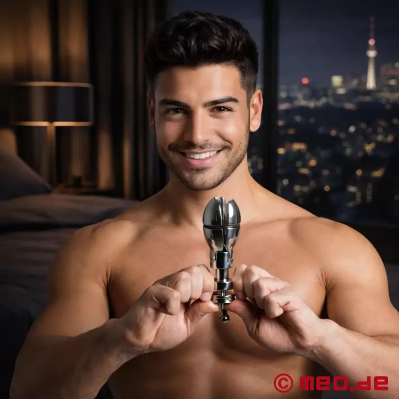 Nuestro plug anal con bloqueo puede introducirse delgado (4,50 cm), extenderse hasta un máximo de 7 cm aprox. y luego bloquearse. La longitud total del plug anal con bloqueo es de unos 15 cm. Material del plug anal con bloqueo: acero inoxidable sin níquel.
