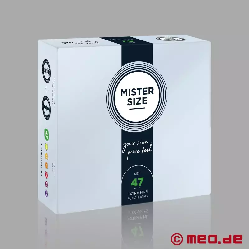 Ajuste perfecto para mayor sensibilidad y protección fiable. Los preservativos MISTER SIZE™ están disponibles en siete tallas diferentes y se ajustan mucho mejor que los preservativos estándar de «talla única» o «XXL».