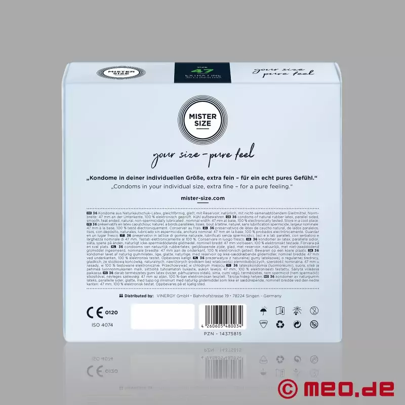 Según la talla, los preservativos MISTER SIZE™ están fabricados especialmente finos. Esto puede ofrecer una sensación más directa que la de muchos preservativos convencionales, sin comprometer la calidad probada.