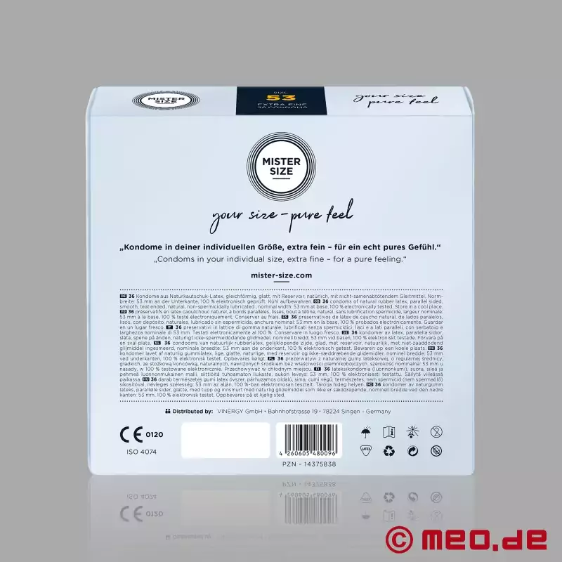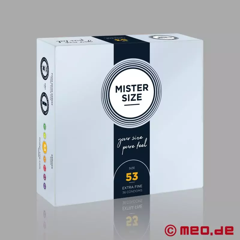 Ajuste perfecto para mayor sensibilidad y protección fiable. Los preservativos MISTER SIZE™ están disponibles en siete tallas diferentes y se ajustan mucho mejor que los preservativos estándar de «talla única» o «XXL».