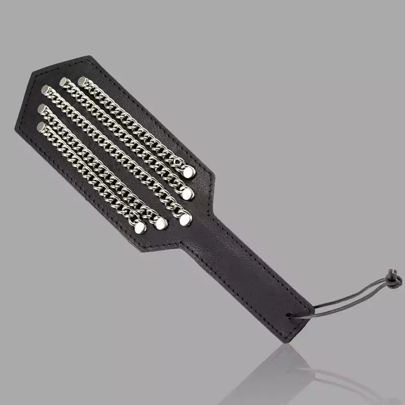 The Chained Leather Paddle is built for one thing: brutal impact play. With smooth saddle leather on one side and five fierce rows of steel chains on the other, this BDSM paddle lets you switch from deep, thudding blows to stinging, unforgettable punishment with a single twist. Whether you want to warm them up or make them beg, this dual-sensory paddle delivers maximum control, weight, and pain.
